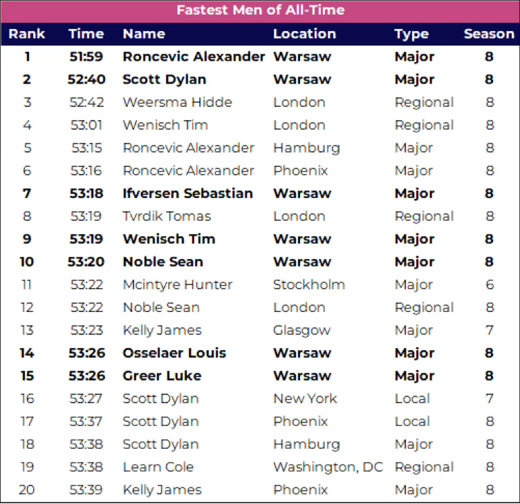 Fast times weren’t limited to the Elite 15 race, as 87% of Pro women and 88% of Pro men set a new lifetime PR in Warsaw. This was not a typical course. Many of these athletes have completed 10+ HYROX races, so it’s not like they’re all experiencing beginner’s gains. It’s virtually impossible for nearly 9-out-of-10 athletes set a PR in the same race, especially when they’re presumably not peaking yet since it’s still 2 months away from HYROX World Championship.