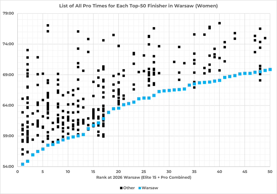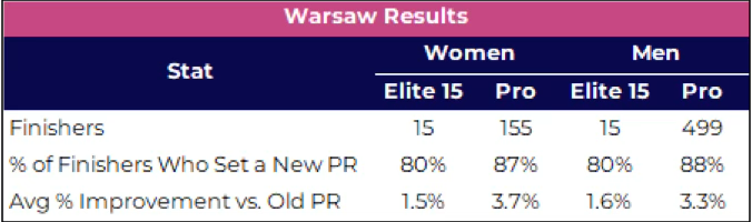 It’s even worse in the women’s race, as 43 of the top-50 finishers set a new PR. Of the 7 women in the top-50 who didn’t set a new PR in Warsaw: