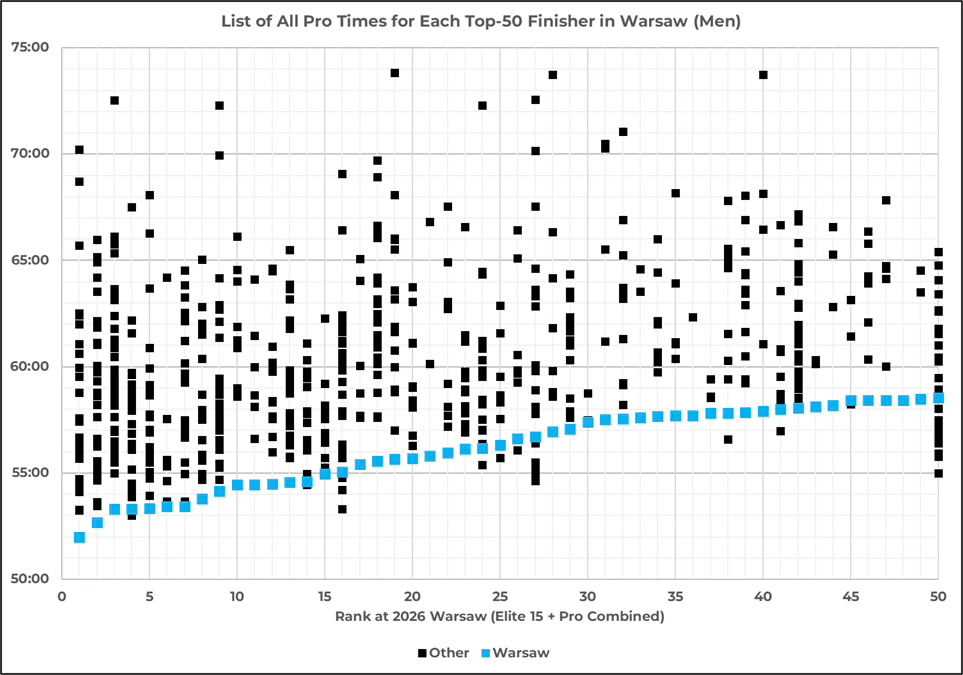 There are 38 blue dots at the bottom of the top-50 men’s columns. You’re telling me that the course was normal yet 38 of the top-50 men happened to set PRs at the same race? Of the 12 men in the top-50 who didn’t set a new PR in Warsaw, 9 ran their 2nd-fastest time ever (average of just 33 seconds slower than their PR).