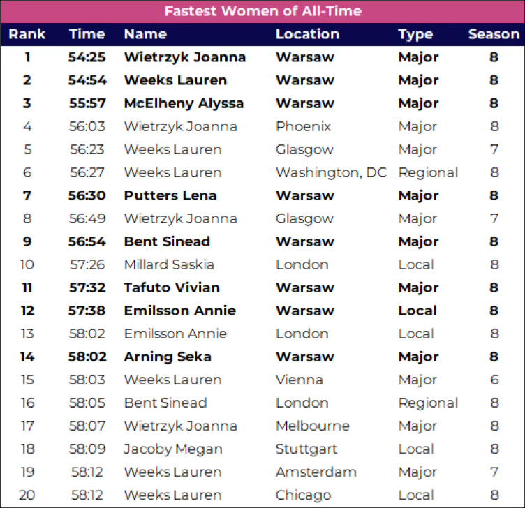 In case you missed it, Joanna Wietrzyk shattered the women’s HYROX world record at the final Major of the season in Warsaw. In one race, the women’s world record dropped from 56:03 to 54:25, a 2.9% improvement. Joanna and Lauren Weeks both skipped the 55-minute barrier entirely, while newcomer Alyssa McElheny also broke the previous world record with a 55:57 showing in only her 4th career race. Once the dust settled, 7 of the 14 fastest women’s times ever run were set over a 15-hour period in Warsaw, including by 2 women who ran the normal Pro race instead of the Elite 15 race: